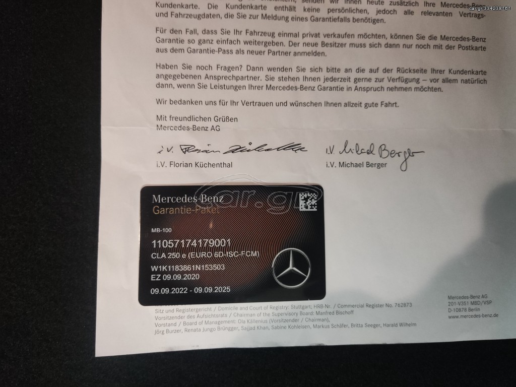 | • ΗΜ/ΝΙΑ ΠΡΩΤΗΣ ΑΔΕΙΑΣ 09/09/2020 • ΕΠΕΚΤΑΣΗ ΕΓΓΥΗΣΗΣ ΕΩΣ 09/09/2025 • ΕΝΑΣ ΙΔΙΟΚΤΗΤΗΣ ! • ΑΤΡΑΚΑΡΙΣΤΟ - ΑΡΙΣΤΟ ! • ΔΕΚΤΟΣ ΕΛΕΓΧΟΣ ! • ΠΛΗΡΕΣ ΑΡΧΕΙΟ SERVICE ΑΝΤΙΠΡΟΣΩΠΕΙΑΣ ! • ΒΙΟΛΟΓΙΚΟΣ ΚΑΘΑΡΙΣΜΟΣ ΚΑΙ ΓΥΑΛΙΣΜΑ ΜΕ ΤΗΝ ΠΑΡΑΔΟΣΗ ! • • • ΕΛΕΥΘΕΡΟ ΣΤΟ ΔΑΚΤΥΛΙΟ !!! • • • • • • ΜΗΔΕΝΙΚΑ ΤΕΛΗ ΚΥΚΛΟΦΟΡΙΑΣ ΑΞΙΑΣ • • • • • • Εξοπλισμός Mercedes-Benz CLA 250e AMG Ediditon 2020 • • • • Αυτόματο & Σειριακό κιβώτιο 8 Σχέσεων • Digital Cockpit ( Πίνακας Οργάνων ) • Media-Display 10.25" • Dynamic Select • Navigation με Live Traffic • Android Auto & Apple CarPlay • DAB Tuner • Ασύρματη Φόρτιση Κινητού • Φώτα Full LED • Φώτα Led ημέρας • Πακέτο AMG + Εdition + Night • Σύστημα υποβοήθησης ορατότητας νεκρής γωνίας • Ζάντες αλουμινίου 18" AMG • Αυτόματος κλιματισμός • Δερμάτινο πολυλειτουργικό τιμόνι 3 ακτίνων με χειριστήρια αλλαγής ταχυτήτων • Δερμάτινο Σαλόνι σε συνδιασμο με Alcantara • Θερμαινόμενα Καθίσματα • Μεγαλο πακετο Δερματος ( Ταμπλό , Πόρτες ,Κονσόλα ) • Διακοσμητικά στοιχεία εσωτερικού σε Αλουμίνιο • Κεντρικό κλείδωμα με τηλεχειρισμό • Υαλοκαθαριστήρες με αισθητήρα βροχής • Αισθητήρας φώτων • Σύστημα αντιολίσθησης τροχών (ASR) • Ηλεκτρονικό πρόγραμμα ευστάθειας (ESP) • Κεντρικό υποβραχιόνιο εμπρος και πίσω με αποθηκευτικό χώρο • Εξωτερικοί καθρέφτες ηλεκτρικά αναδιπλούμενοι • Εσωτερικά προστατευτικά μαρσπιέ αλουμινίου με λογότυπο Mercedes-Benz • CRUISE CONTROL - Σύστημα ρύθμισης ταχύτητας • ASSYST PLUS - ένδειξη διαστημάτων συντήρησης • Κάμερα οπισθοπορειας • Αισθητήρες παρκαρίσματος εμπρός & πίσω • Σύστημα αυτόματου παρκαρίσματος • ISOFIX - σύστημα ασφάλισης παιδικών καθισμάτων • Active Brake Assist ( Mπορεί να βοηθήσει να αποτραπούν ή να μετριαστούν οι επιπτώσεις ατυχημάτων με προπορευόμενα οχήματα και με πεζούς που διασχίζουν το δρόμο μπροστά. Περιλαμβάνει μια λειτουργία παρακολούθησης της απόστασης και προειδοποίησης σύγκρουσης ) • Lane Keep Assist ( Προειδοποιεί τον οδηγό όταν το όχημα κινείται από τη λωρίδα ) • Keyless Έναρξη • Αλεξήλια με φωτιζόμενο καθρέπτη • Πακέτο Ατμοσφαιρικου εσωτερικού φωτισμού • Λειτουργιά ECO Start / Stop • Πίσω φωτιστικά σώματα LED (και φωτισμός πινακίδας LED) • Audio interface AUX - USB • Bluetooth • Bluetooth® με λειτουργία audio streaming για μεταφορά μουσικής • Αερόσακος γονάτων οδηγού (KNEEBAG) • Σύστημα ελέγχου πίεσης ελαστικών • Θερμομονωτικά σκούρα φιμέ κρύσταλλα |