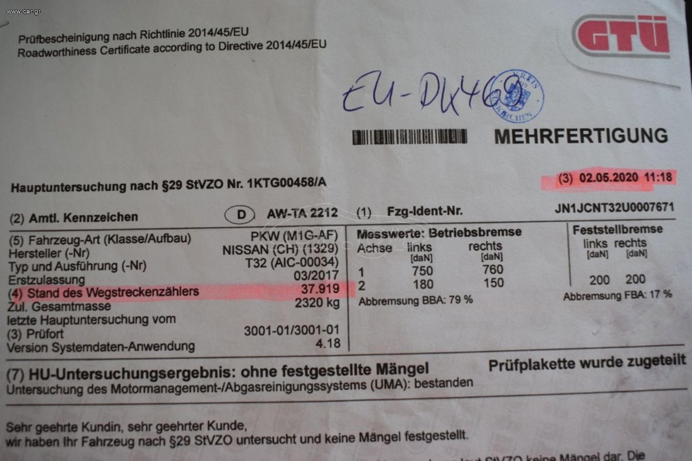 | Τιμή για Τριτεκνους και Πολυτέκνους AUTO GOUGOULIAS H Σιγουριά που Αναζητούσατε ! ✅ Διαθεσιμότητα: Σήμερα στο Κατάστημα ✅ Άμεση Χρηματοδότηση από 0% Προκαταβολή Εως 72 Δέσεις ✅ Καινούρια Μπαταρια: BOSCH 12V 70Ah/760A Start&Stop EFB ✅ [4] Καινούρια Ελαστικά 245/55 R19' V - <270 km/h [Περιλαμβάνονται] ✅ Εκτιμώμενος Χρόνος Παράδοσης: +/- 3 Εργάσιμες Ημέρες (από την Παραλαβή της Πληρωμής) ✅ Tιμη: 22.999 € Συμπεριλαμβάνεται το Ε.Τ.Τ [Τελωνείο] ✅ Αριθμός Ταυτοποίησης Οχήματος ✅ Πιστοποιημένες Πληροφορίες Σύμφωνα με τον Αριθμό Πλαισίου του Αυτοκίνητου EnVKV ✅ FIN: JN1JCNT32U0007671 ✅ E.Ι.Χ. ✅ Μάρκα: Nissan ✅ Μοντέλο :X-Trail III SUV (T32_, T32R, T32RR) ✅ Έκδοση: Tekna Plus+ 1.6 dCi ✅ Κυβωτιο: Μηχανικο 6/Τ ✅ Είδος Καυσίμου: Πετρέλαιο Diesel ✅ Model: 2017 ✅ Προδιαγραφές Εκπομπών Ρύπων: Euro6 ✅ Χρώμα Εργ. Κωδικός : BLACK PEARL (M) ✅ Σύστημα: Economy Start/Stopp ✅ Κυκλοφορεί Ελεύθερα στο Δακτυλιο ✅ Διανυθεντα Χιλιόμετρα: 60.243km ✅ Τύπος Οχήματος: SUV/ Crossover 4Χ4 ✅ Τύπος Αμαξώματος: 5-Θυρο ✅ Αριθμός Επιβατών: 7 Θέσεις ✅ Κυβωτιο Ταχυτήτων 6/Τ ✅ Τεχνική Ικανότητα σε CCM: 1598ccm ✅ Ισχύς Κινητήρα:[HP]: 131Hp ✅ Ισχύς κινητήρα [KW]: 96kW ✅ Κωδικοί Κινητήρα: R9M ✅ Προδιάγραφες: Γερμανίας ✅ Χωρα Προέλευσης: Γερμανια ✅ Περιγραφή Οχήματος: Nissan X-Trail III SUV T32 Τετρακίνησή 4Χ4, Κινητήρας 1,6 ltr. - 96Kw turbo diesel KAT, 131 Ίπποι, KAT, Partikelfilter Φίλτρο Σωματιδίων, Φίλτρο Γύρης, Αμάξωμα Σώμα: 5-Θυρο, Μεταλλική βαφή BLACK PEARL (M), Αριθμός Επιβατών 7 Θέσεις, Μεταξόνιο 2706 mm, Eκδοση Tekna Plus+ Χαμηλές Εκπομπές Ρύπων g/km1 CO₂-Emissionen 139, Σύμφωνα με το Πρότυπο Εκπομπών Καυσαερίων Euro6, Κατανάλωση Καυσίμου 4.80 L/100km, Κυκλοφορεί Eλευθερα στο Δακτυλιο, Τελη Κυκλοφορίας [264,80 €]. ✅ Ειδικός εξοπλισμός: Σχεδιασμός και Γραμμή Εξοπλισμού Πακέτο:Tekna Plus+, Τετρακίνησή 4Χ4, Πανοραμική Οροφή, Εσωτερική Διακόσμηση Καθισμάτων Πλήρες: Δέρμα Nappa Μαύρο, Πακέτο 7 Θέσεων, Πακέτο Style-Paket, Πλανά Σκαλοπάτια, Ράγες Οροφής, Δια Χύτης (Diffuser) Σπόϊλερ Προφυλακτήρα Εμπρός & Πίσω, Πακέτο Nissan Safety Shield Κάμερα Περιμετρικής Θέασης (AVM), 360°, Αυτόματο Κλιματισμό 2 Ζωνών, Αυτόματο Start/Stop, Αυτόματη Εκκίνηση / Διακοπή, Δερμάτινο Τιμόνι Μικρών Διαστάσεων, Πολ λειτουργικό Τιμόνι με Ενσωματομετα Χειρισργρια, Αισθητήρα Βροχης, Ηλεκτρικό Σύστημα Ακινητοποίησης Οχήματος, Σύστημα Πλοήγησης Σύστημα Ήχου Nissan Connect με Eγχρωμη Οθόνη Αφής, Κάμερα 360°, Κάμερες στην Εμπρός Μάσκα στο Έμβλημα στους δυο Εξωτερικούς Καθρέπτες στην Πισω Πινακίδα και στο Παρμπρίζ Εμπρός, Εγκατάσταση hands-free Ανοιχτή Aκροαση Τηλεφώνου, Λειτουργία Bluetooth, Εξωτερικές Χειρολαβές σε Χρώμιο, CD player,, Αυτόματα Αναδιπλούμενοι Καθρέπτες Hλεκτρικα Ρυθμιζόμενα Καθίσματα, Θερμενομαινα Καθίσματα, Κάθισμα Οσφυϊκής Στήριξης Μπροστά Αριστερά, Προβολείς Ομίχλης, Μεταλλική βαφή Μαύρο BLACK PEARL (M), Ζάντες Αλουμινίου LM. 19' Ιντσών. ✅ Περαιτέρω εξοπλισμός: Μπροστινοί Αερόσακοι Οδηγού/Συνοδηγού, Πλευρικοί Αερόσακοι Οδηγού/Συνοδηγού Αερόσακος, Πλευρικός Αερόσακος Συνοδηγού Μπορεί να Σβήσει, Σύστημα Αερόσακων Κεφαλής, 3ο φως Φρένων, Λειτουργία Ηχου/Εσωτερικού Υπολογιστή στο Τιμόνι, Πακέτο Εξοπλισμού: Nissan Connect με Around View Monitor + Safety Shield 360° Navigation Πλοήγηση, Οθόνη Αφής 12" Πακέτο Ηχοσύστημα: Ραδιόφωνο/CD Player, με 6 Ηχεία, Πανοραμική Γυάλινη Οροφή, Πακέτο Προβολέων Αυτόματη Εναλλαγή, Ηλεκτρικοί Εξωτερικοί Καθρέφτες. Ρυθμιζόμενοι και Θερμαινόμενοι, Υπολογιστής Οχήματος, Βοηθός φρένων (Nissan Brake Assist), Λειτουργία Φώτων (Friendly Lightning), Βοήθημα Στάθμευσης, Πακέτο Υποβοήθησης Οδηγού Tekna, Σύστημα Υποβοήθησης Οδηγού: Ενεργός Έλεγχος Άνεσης Οδήγησης (Απόσβεση Πλαισίου), Σύστη